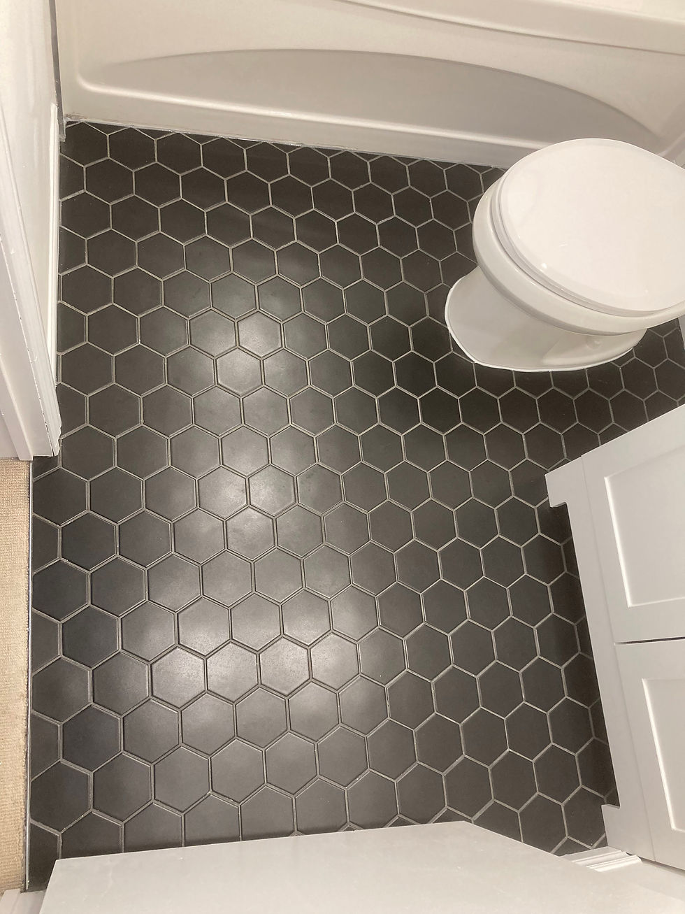 Lastly, the beautiful hexagon porcelain mosaic tile with charcoal grout adds a lot of style to the space and makes this a washroom for any potential buyer to remember.