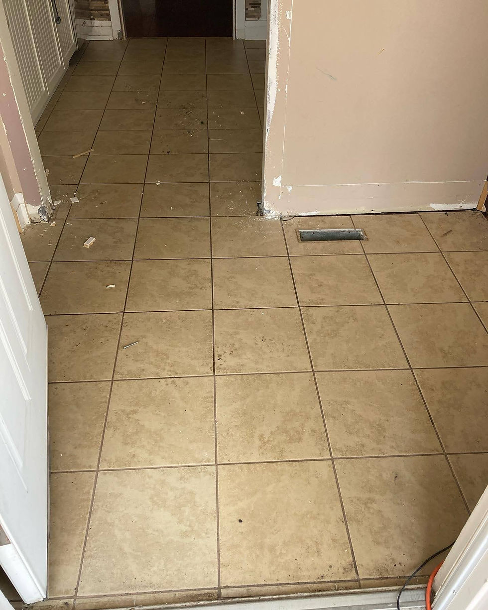 This was achieved in the kitchen by installing new light coloured glossy finish 12” x 24” floor tile, along with replacing the existing brown laminate countertops with white quartz countertops. To keep this quick reno project as cost efficient as possible, the new tile was installed directly over the existing 12” x 12” beige builders tile. This eliminated a lot of cost associated with chipping out the old floor tile, along with keeping dust to a minimum. Money was also saved by being able to keep the existing glass mosaic backsplash. This created an extremely tight squeeze and a more difficult install for the new countertop, but the final result and financial savings were well worth it.