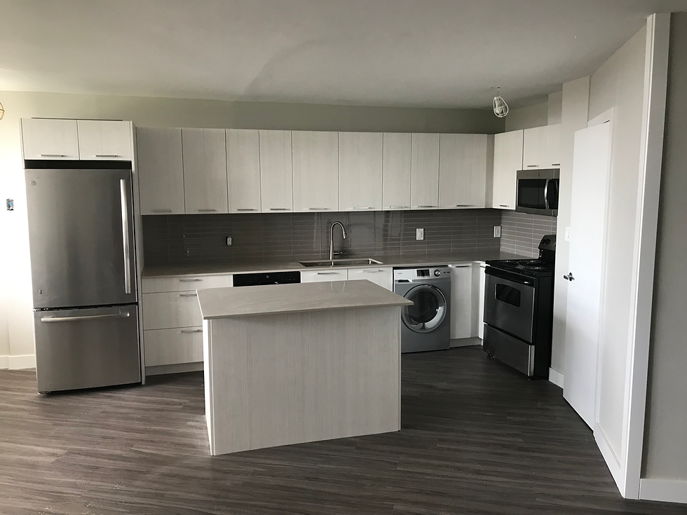 Due to limitations within an older apartment building, a washing machine was integrated into this kitchen for its future tenants. Removal of a wall to the living room and installation of an island really opens up the space to make it feel bigger and adds a lot of natural light.