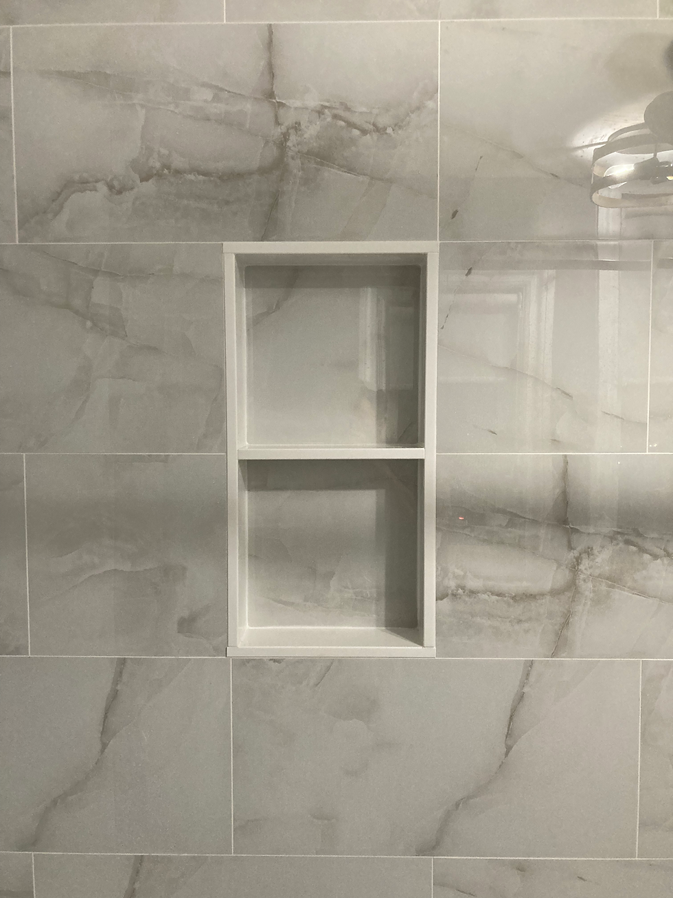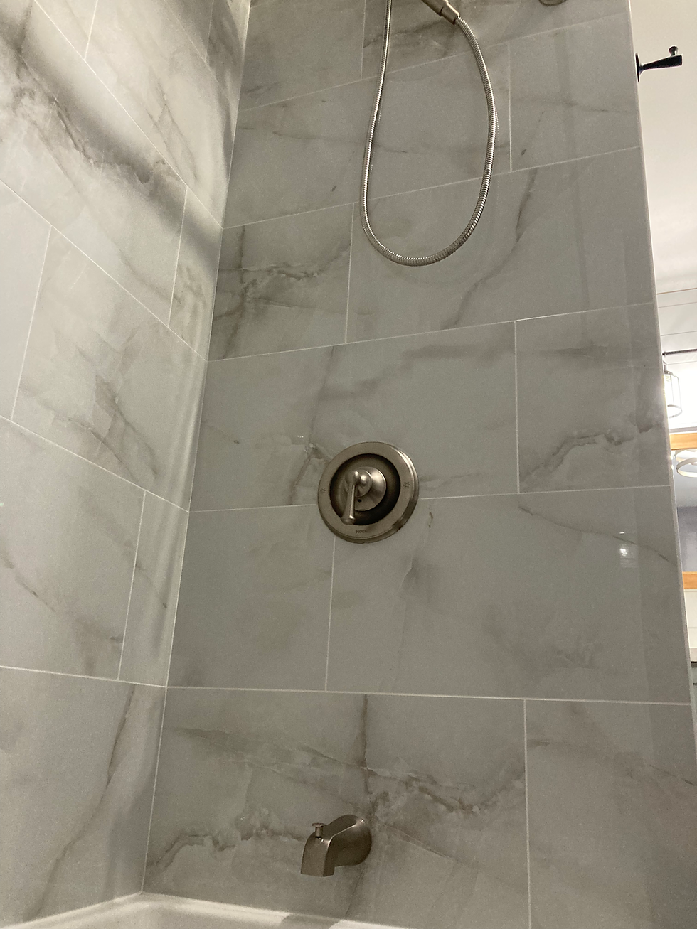 The new tile chosen provides a great new sleek feel to this tub shower, and the colour of the tile compliments the wall paint in the bathroom very well. With all the different shower products used between both the adults and children in the home, a custom double shelf niche was installed to provide some much needed organized storage within the shower while also acting as an accent piece to the wall tile.
