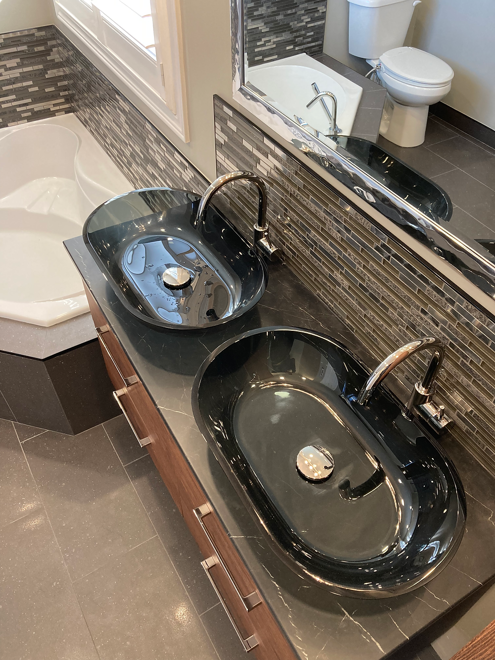 This floating double vanity features a great color scheme of black, wood, and chrome metal to give it a modern feel with a lot of personality. The top mounted black glass bowl sinks are an amazing feature on this vanity that really give it a unique look, and continuing the same backsplash behind the vanity to match the backsplash around the tub brings a lot of dazzle to the room.