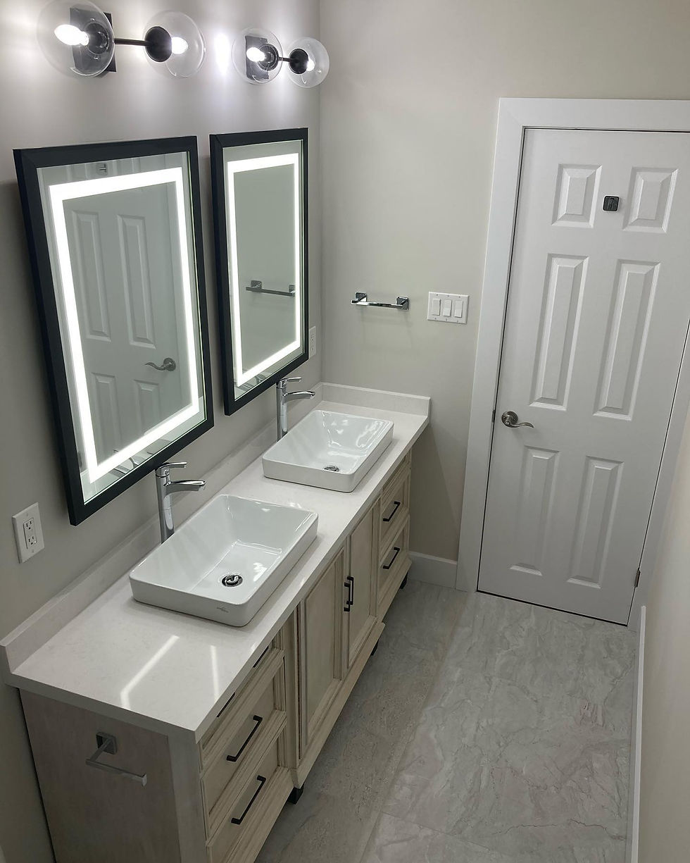 This bathroom renovation came out beautifully, modernizing the space from its old 90s decor, to a sleek new clean feel. The bathroom was a already a good size prior to the renovation, but now has an increased foot print, and a few new bells and whistles.