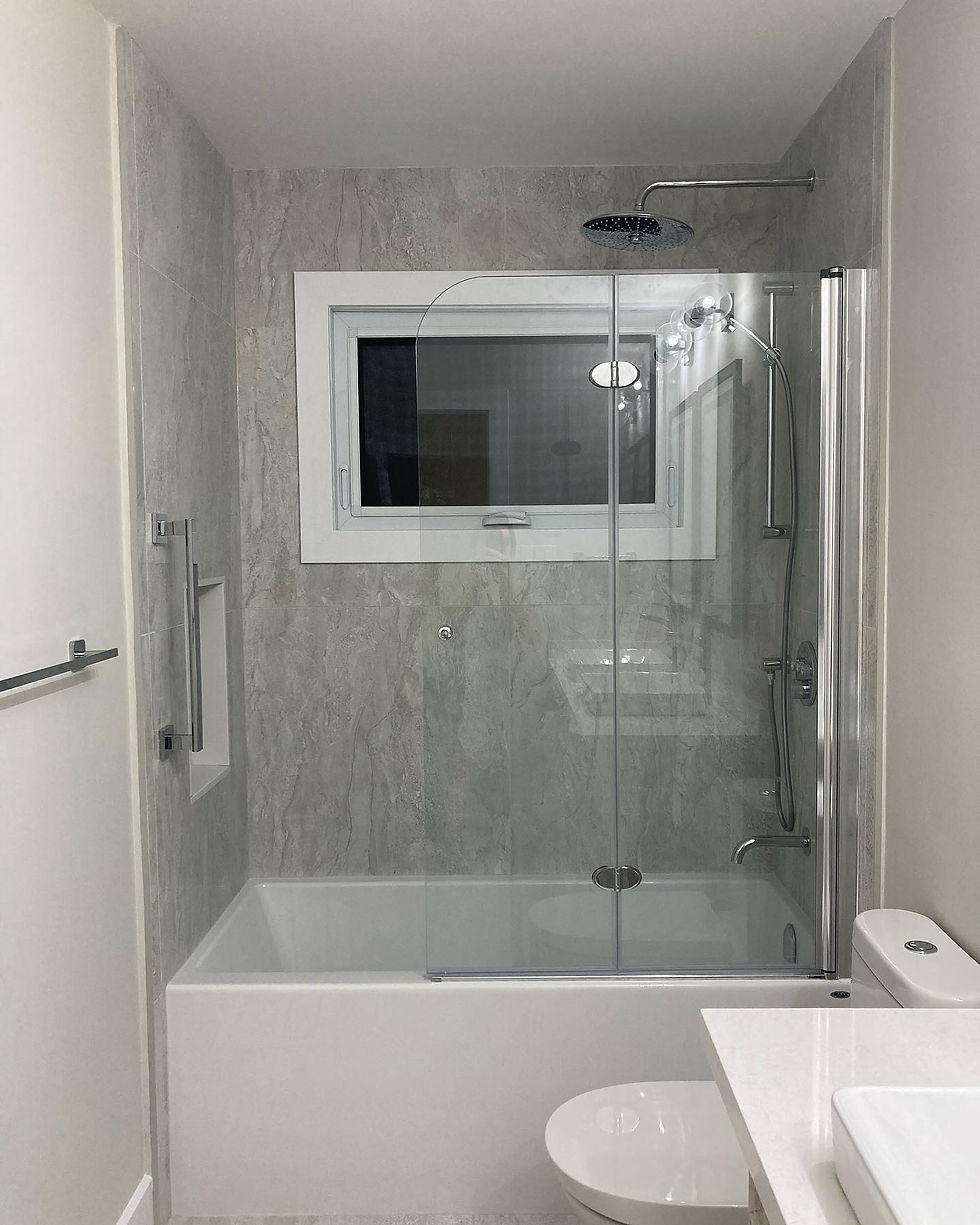 Another great feature in this bathroom is the installation of a bi-fold glass shower door. This door gives the user easy access to the shower controls when turning on the shower, as well as the ability to fold out of the way when taking a bath.