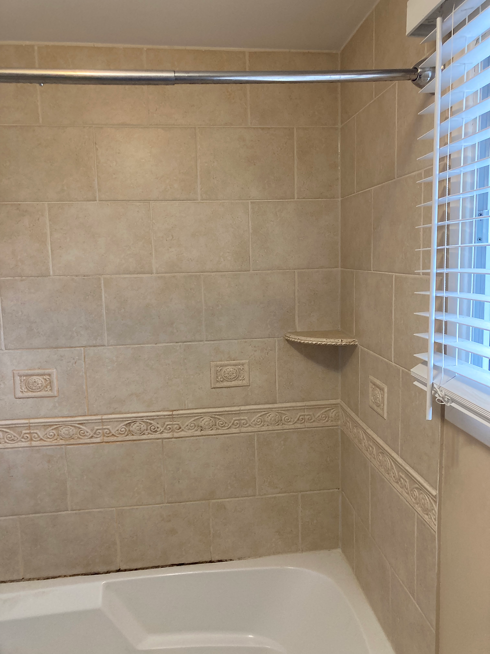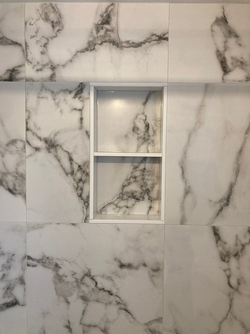 The homeowner of this fresh new bathroom made some great choices in updating this space while keeping the budget as low as possible. The existing soaker tub was still in good shape, and just needed a bit of a paint job to the profiled shaker trim that was on the skirt of the tub. Updating the tile to a bigger 24" x 24" porcelain with scrambled black veining turned this tub shower into a shower with some personality, while adding the custom double shelf niche added much needed storage for a bathroom shared by multiple young adults in the house.