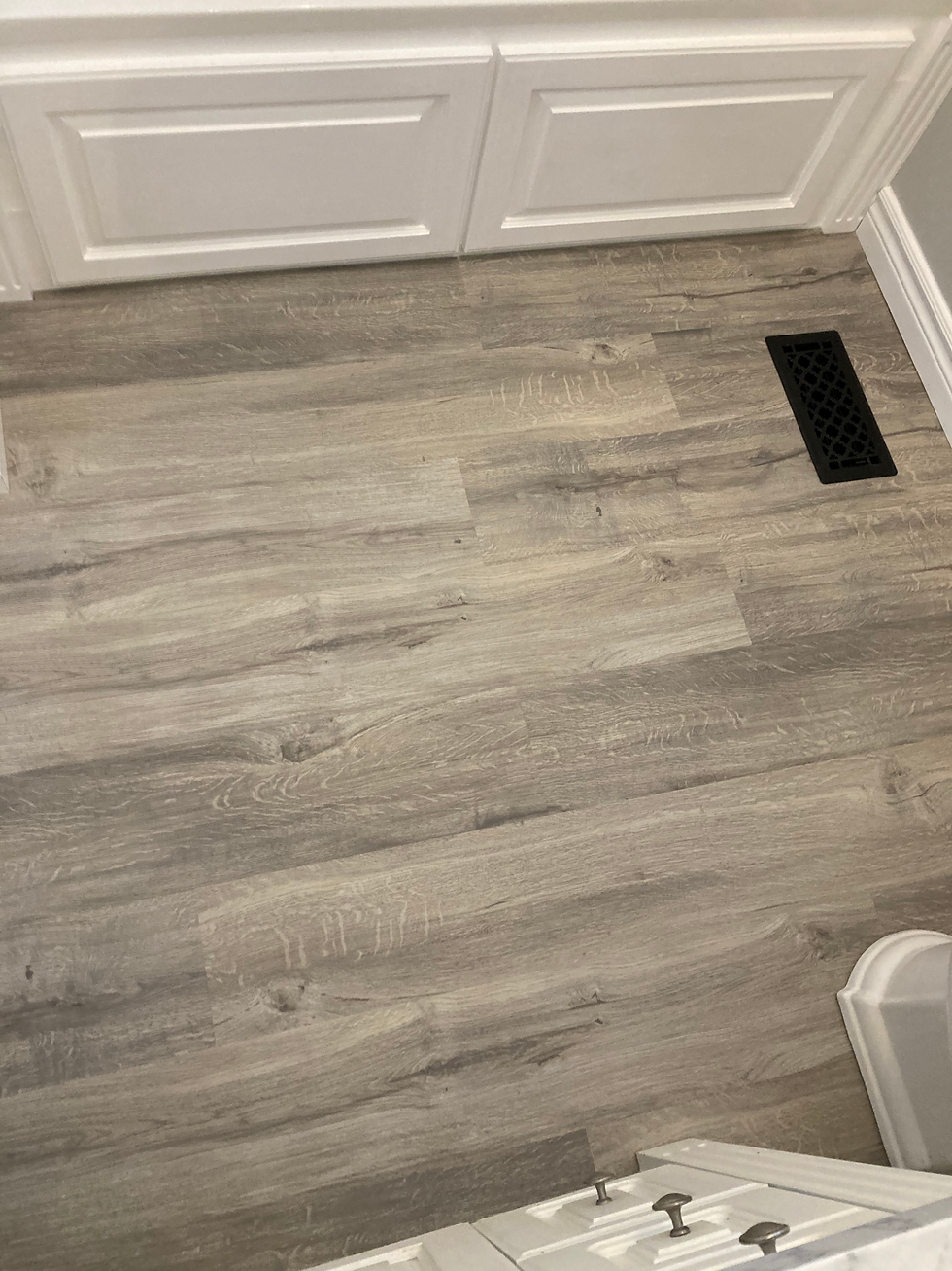 The existing cabinet base of the vanity was still in decent shape, and a swapping of the old green countertop to a modern grey quartz works great with both the new wall color and flooring. The flooring installed in this bathroom is a luxury vinyl click flooring, perfect for wet areas as a fully synthetic product. Luxury vinyl flooring is a great choice for bathrooms as it provides a flooring choice that looks updated, feels good to walk across, and is extremely resistant to water while being a very budget friendly product.