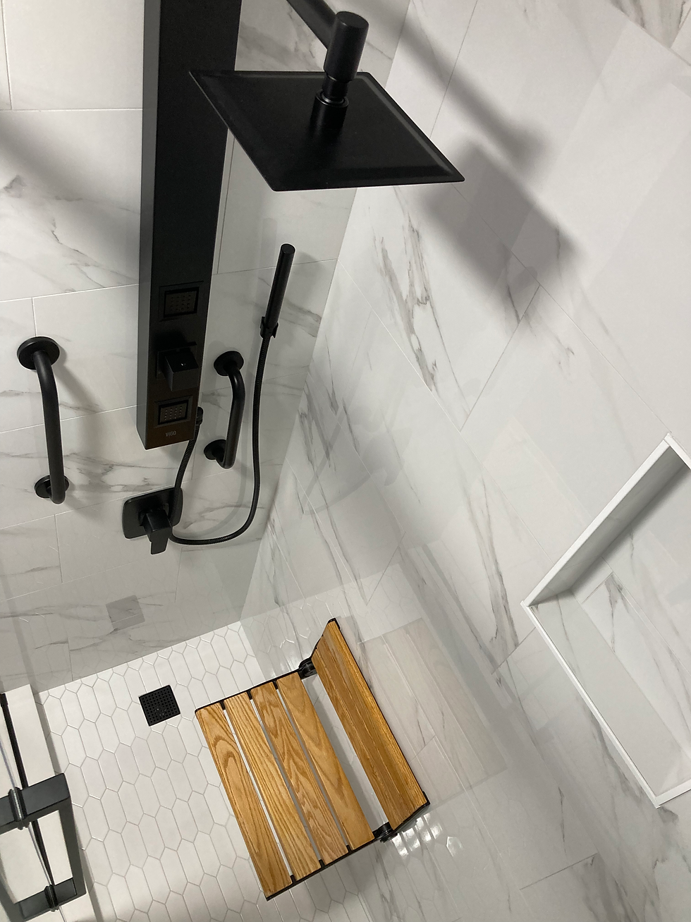 The new black sliding glass doors now act as a main style feature within the bathroom along with the new tower faucet unit featuring a handheld and jets. the new shelf niche added is a great aesthetic touch, however it is the aspect of safety that the niche brings to prevent unnecessary bending over within the shower for shampoo and soaps that really gives it value to the renovation. Further continuing with safety features within this basement shower is the addition of the wall hung floating bench seat. Along with the safety grab bars installed on either side of the tower faucet, this seat provides the senior homeowners with a feeling of stability to have the option of sitting when showering while also being a nice accent piece to the color scheme of the shower.