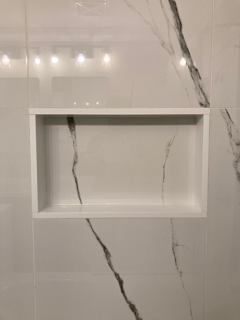 The very large 4' x 2' tile used in this shower provide a beautiful modern look with black veining that adds style but is not over powering or too busy. The black veining in this tile meshes perfectly with the floor tile in the bathroom (see part 2) and the shower now features plenty of space for storage of shampoo and soaps in both the new shelf niche and on top of the half wall shower sill