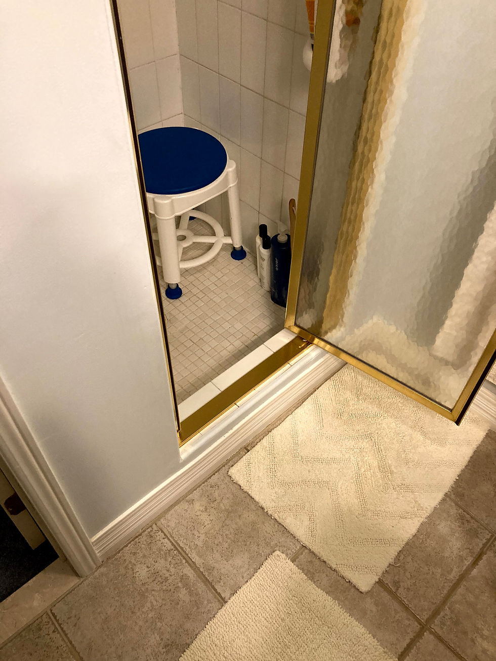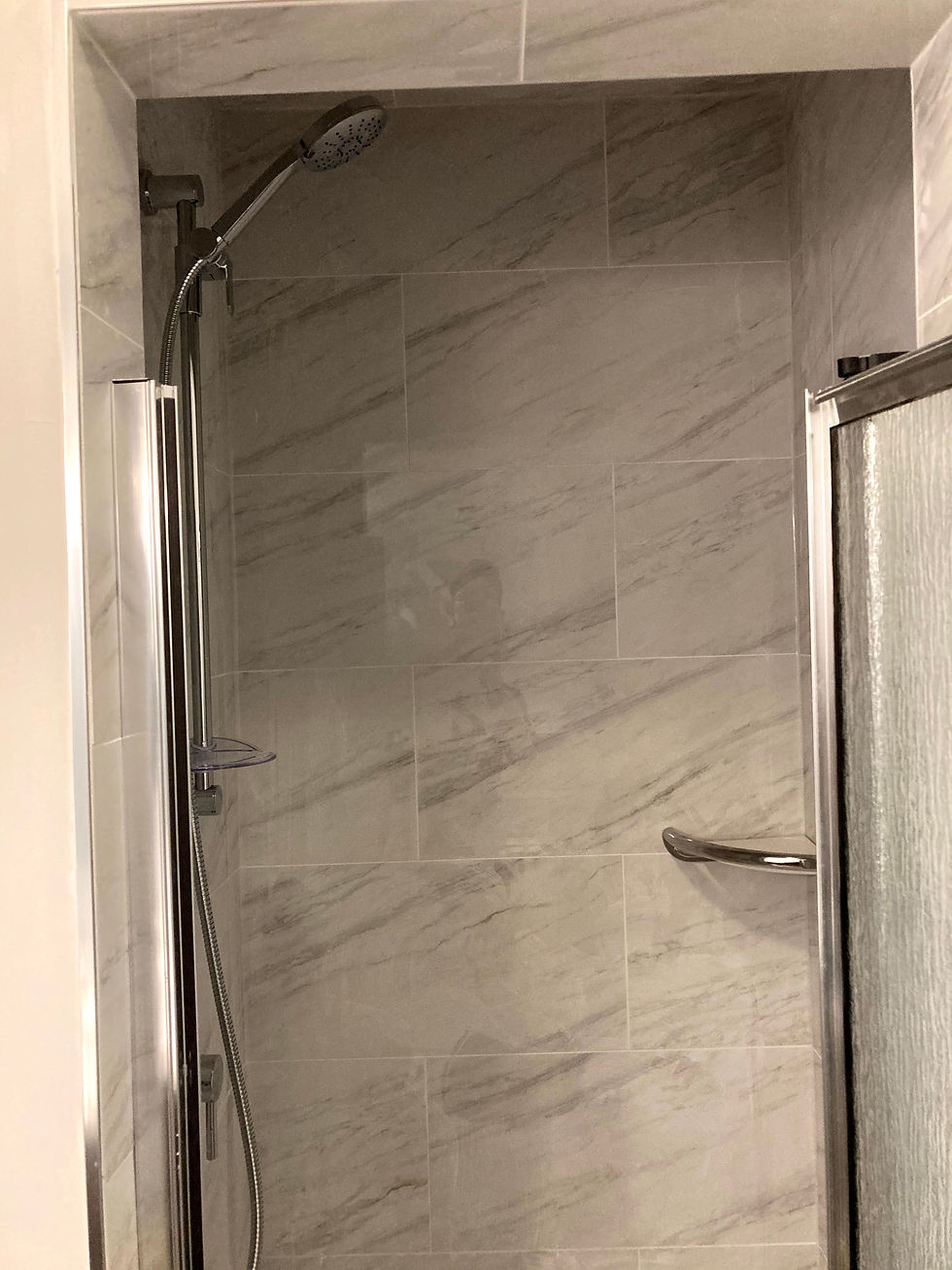 The entire shower was gutted and replaced with high quality Wedi shower board and sealent. 12" x 24" tile was installed to replace the existing 3"x 6" square subway tile for an updated look. A chrome shower fixture with adjustable handheld on a slide bar was installed, and a small glass triangular corner shelf with support bar was installed to hold shower items and provide safety assurance when entering and exiting the shower.