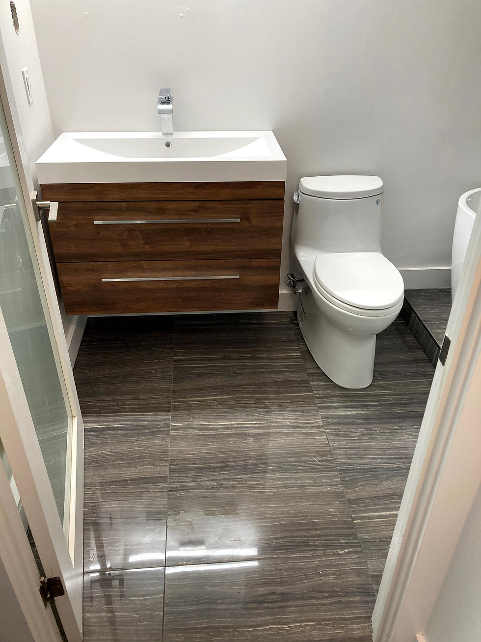 The definition of simple, yet beautiful. A waterfall style wall to floor of continuous tile with matching dark grout gives this washroom a lot of style in a very simple and modern way. This tile is dark, but with the other walls remaining white the washroom does not feel small. A new wall mounted vanity was installed to match the color of the tile, but the real highlight of this space is the freestanding modern soaker tub. A flat waterfall faucet was installed with a digital photo picture frame over top to complete the modern and relaxing feel of this washroom